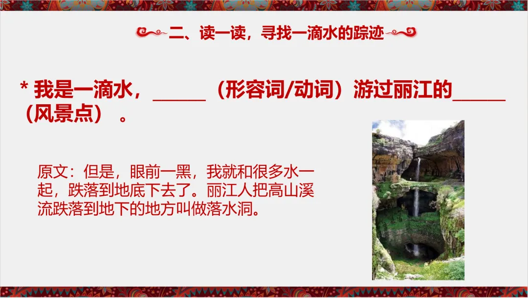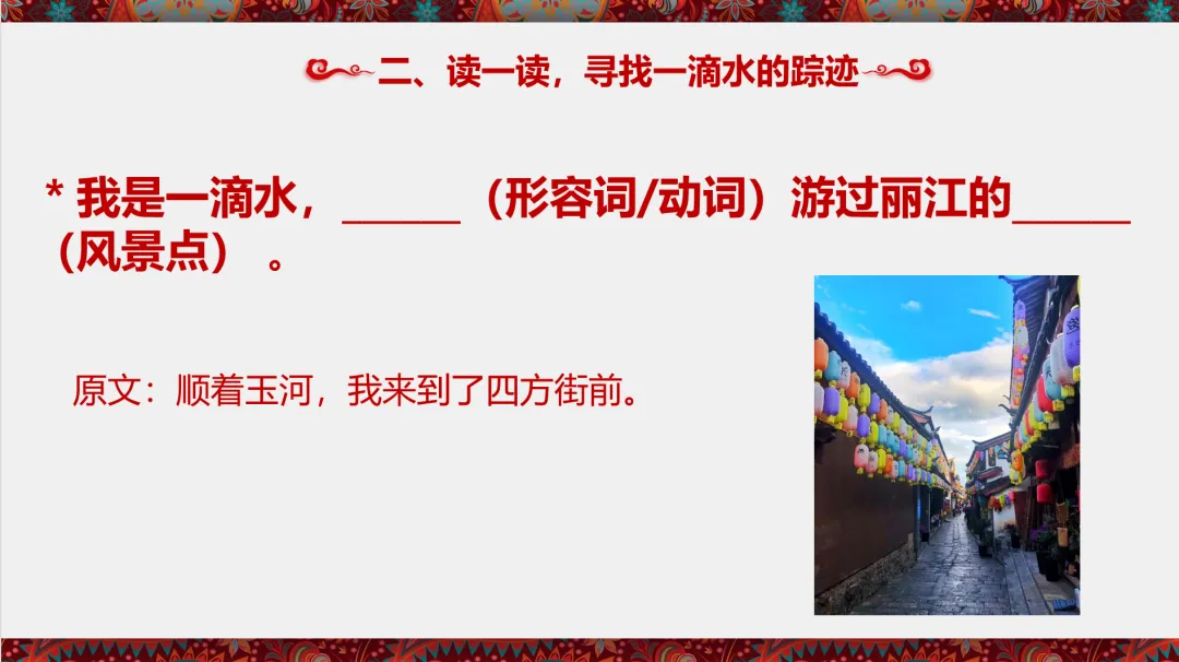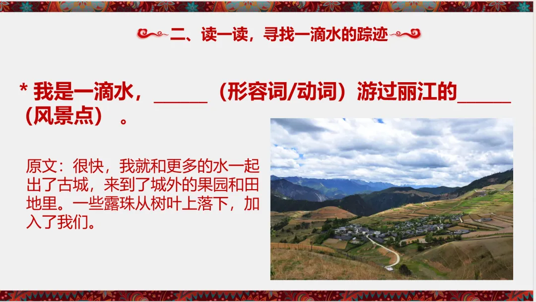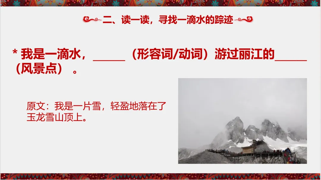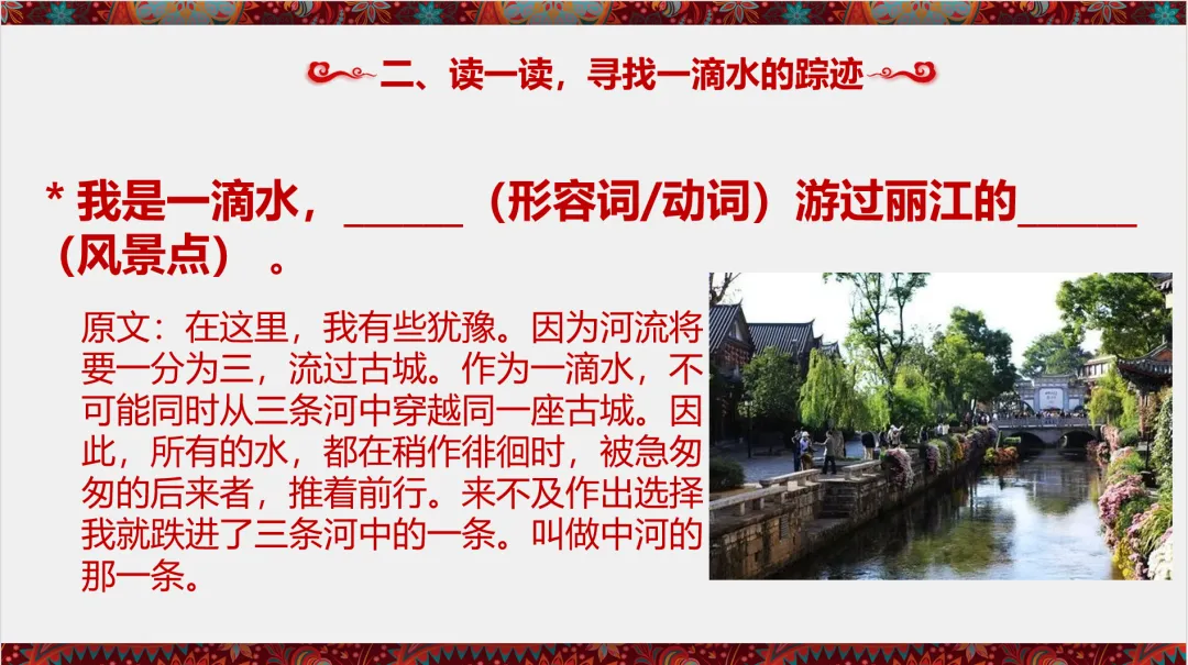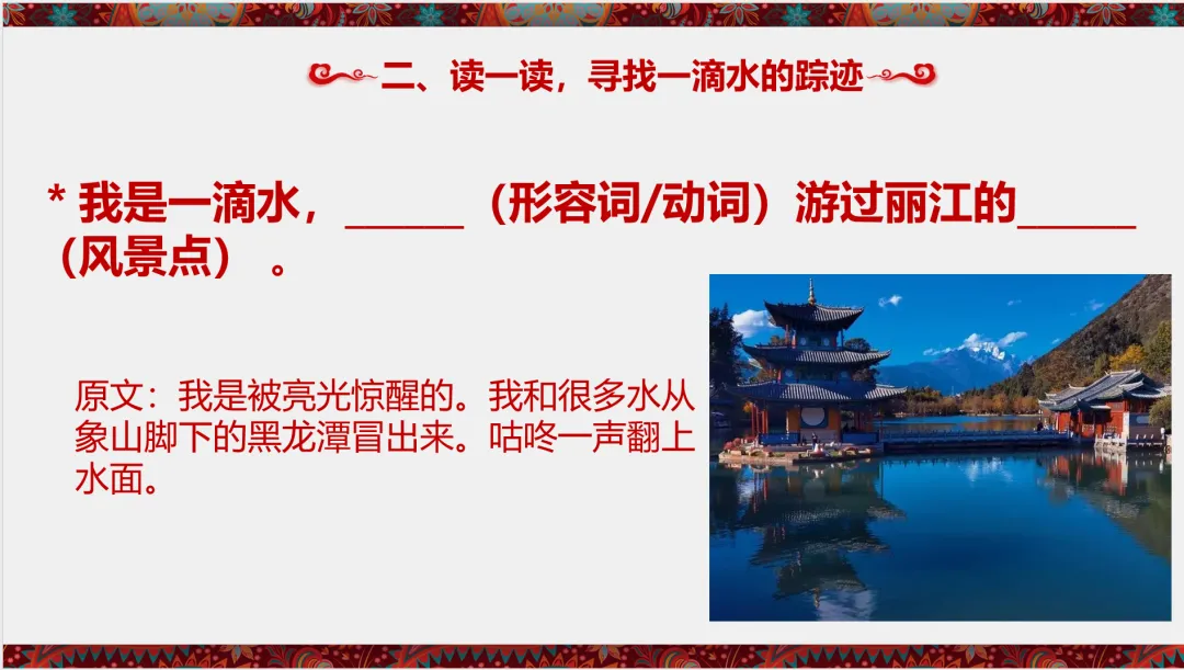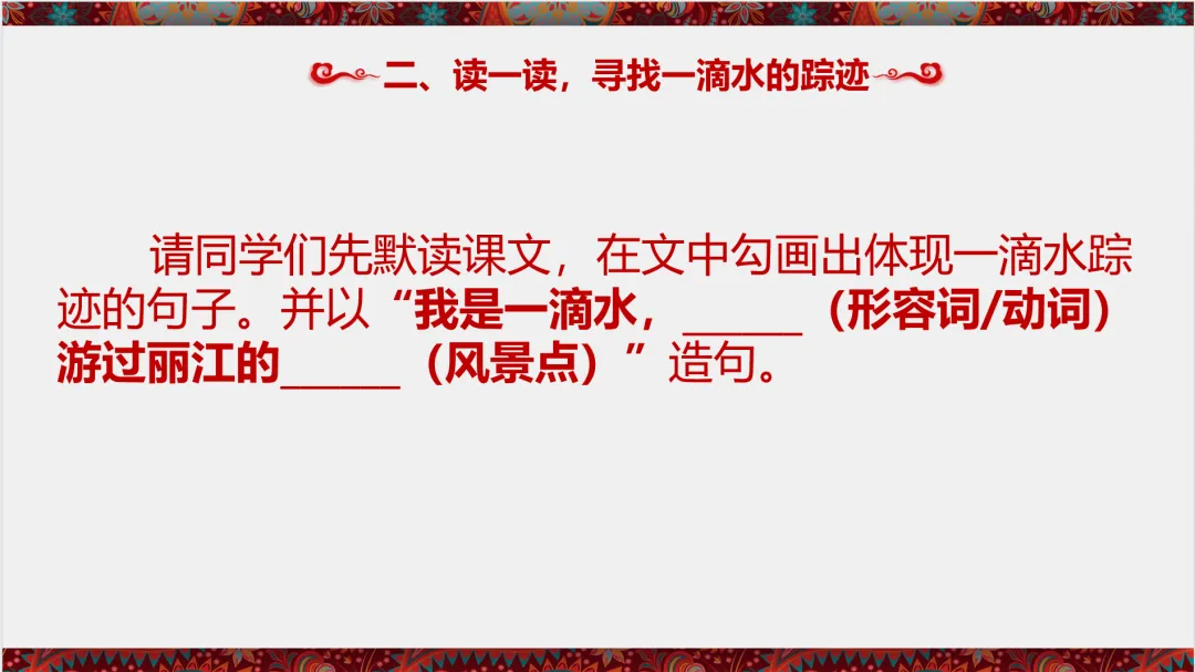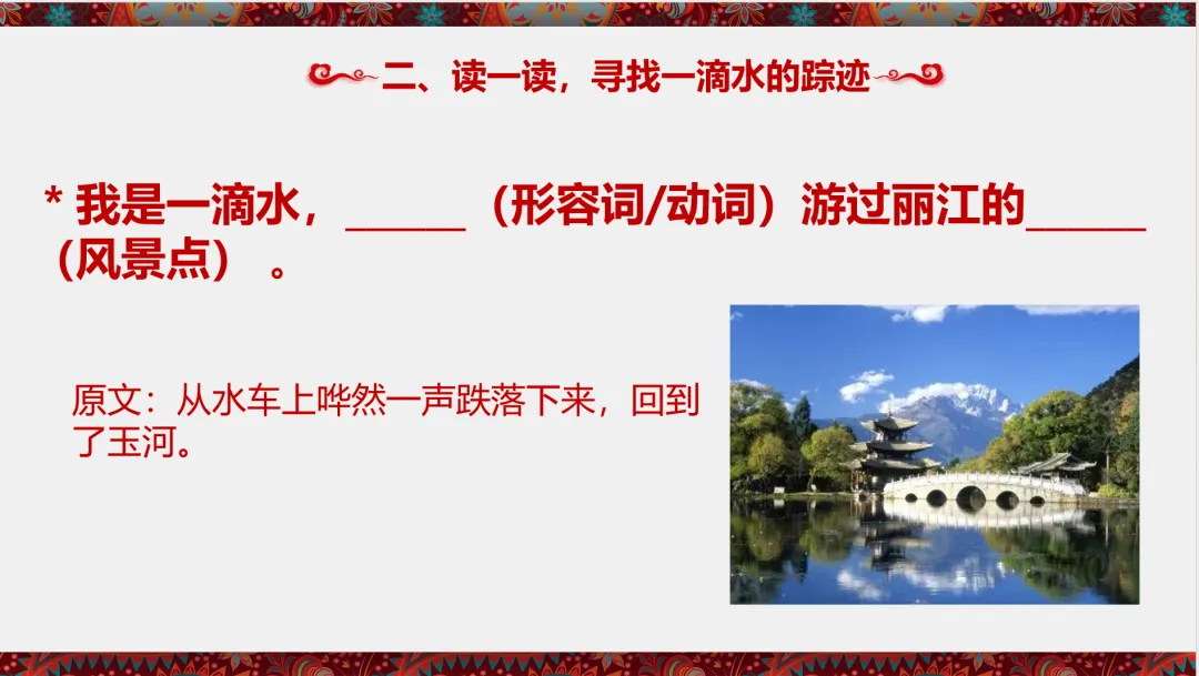请同学们先默读课文,在文中勾画出体现一滴水踪迹的句子。并以“我是一滴水,______(形容词/动词)游过丽江的______(风景点)。”