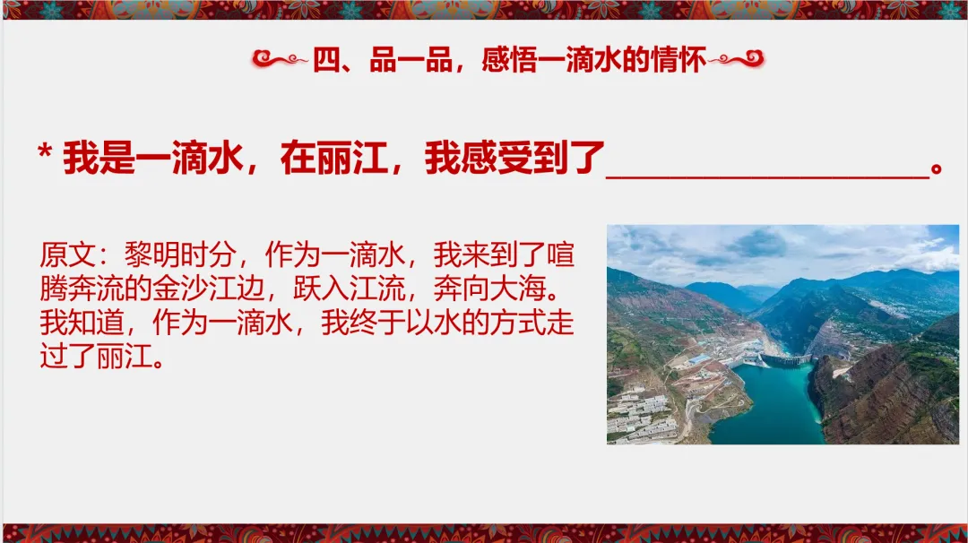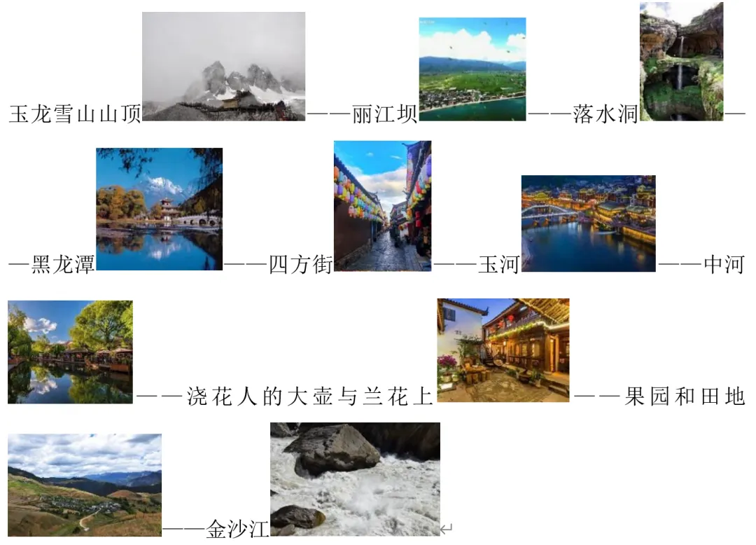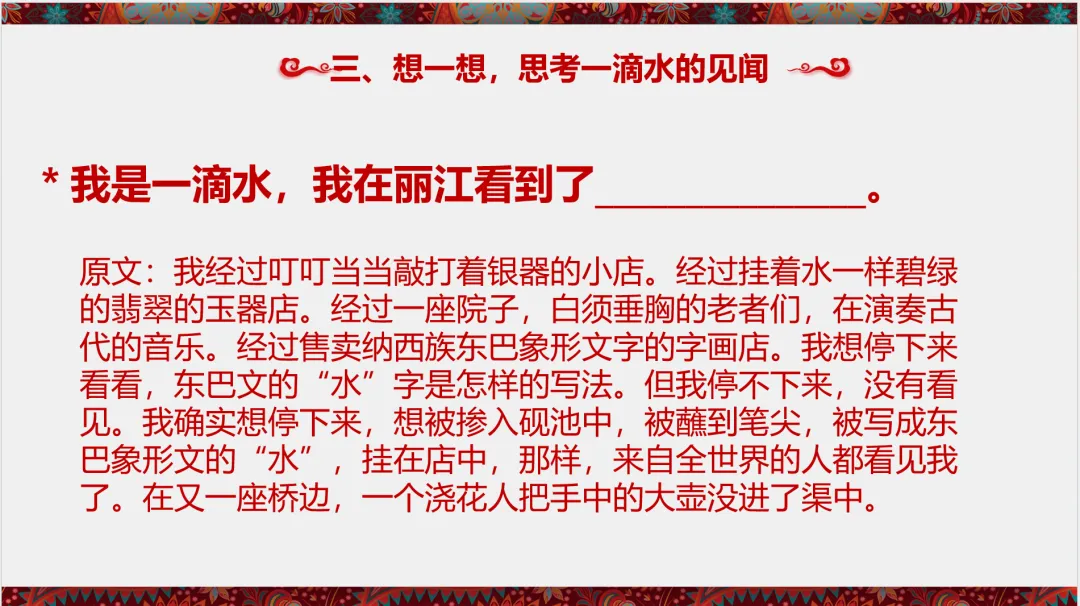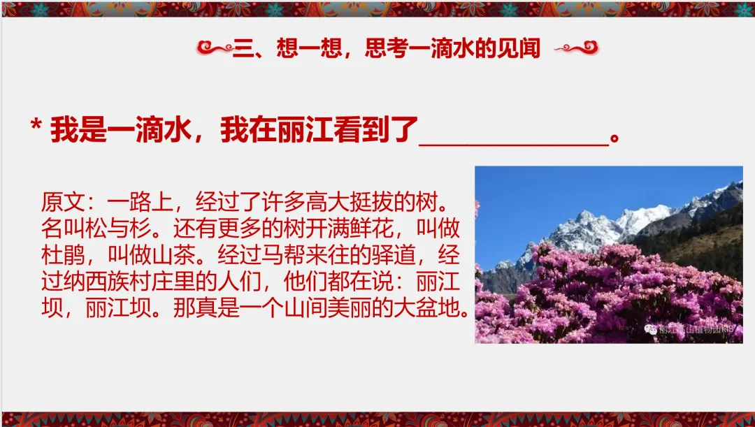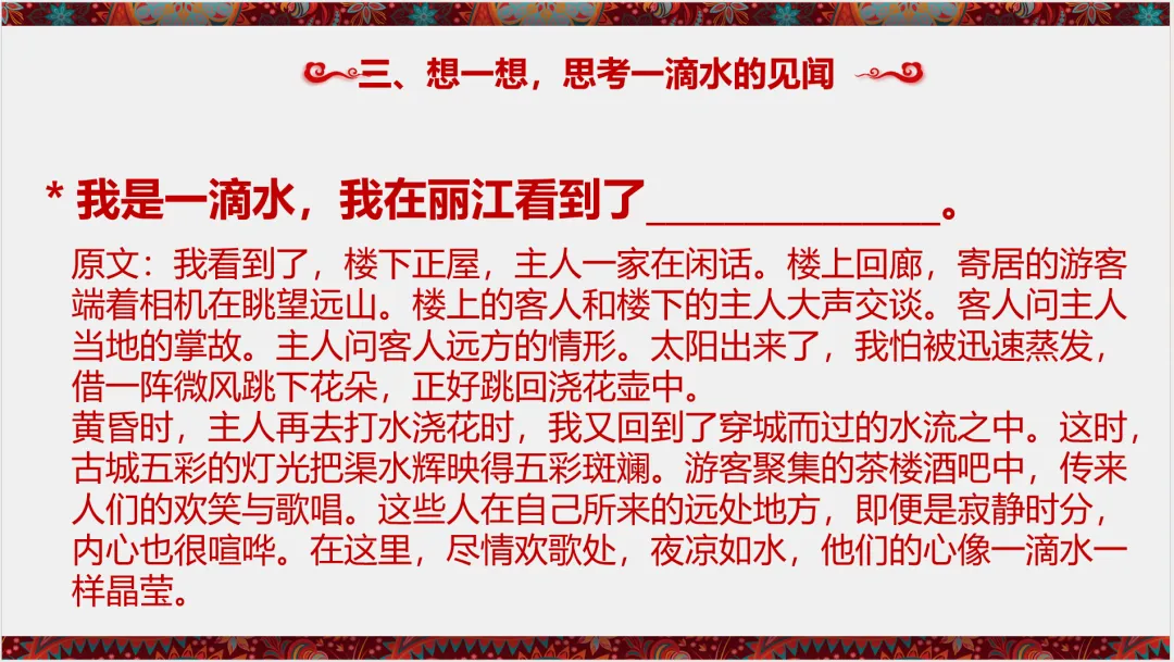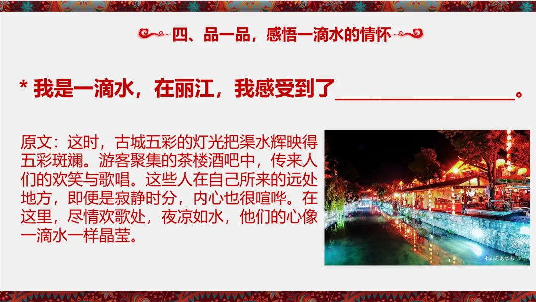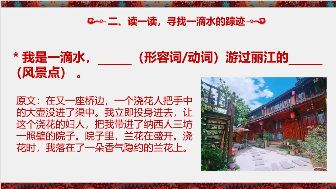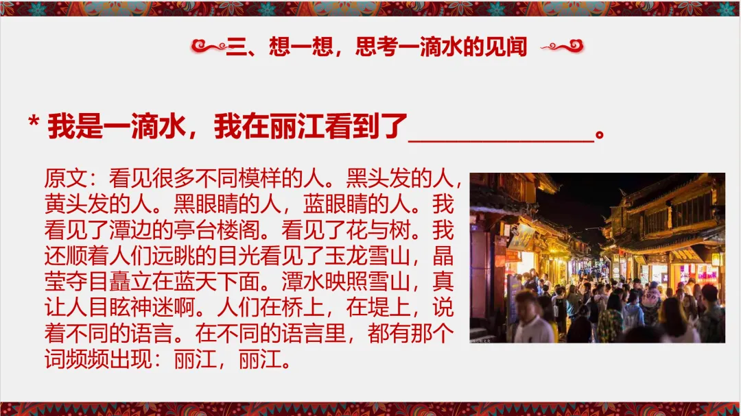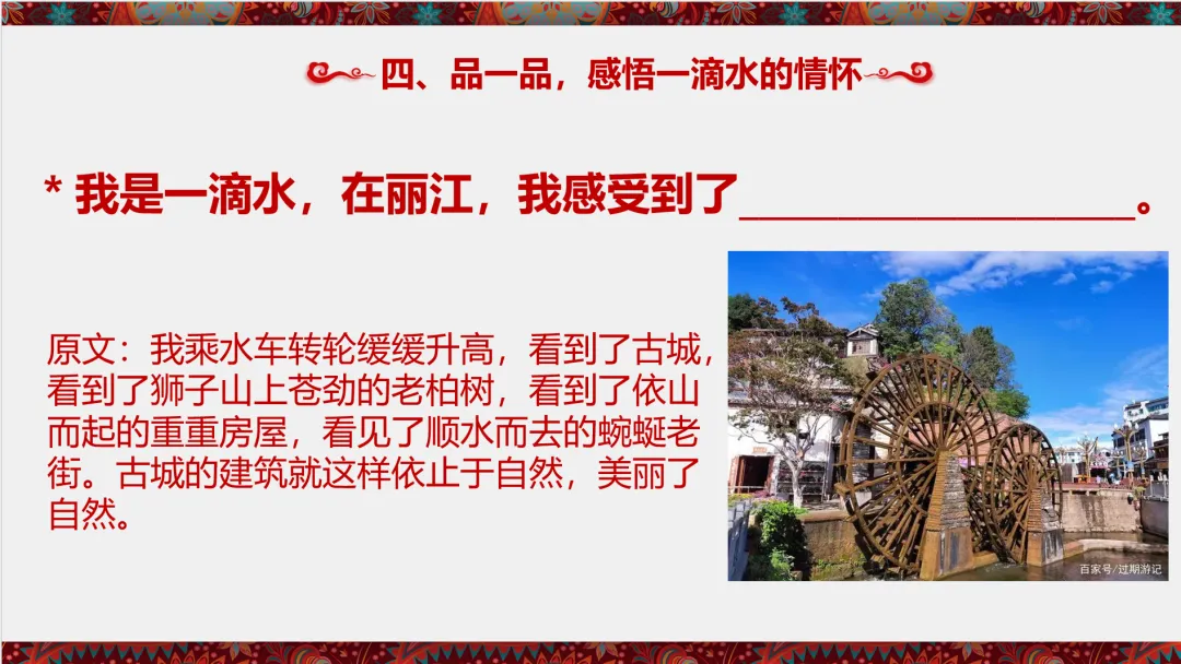 教师总结:游记作品当中,常常以地点的转化为线索,来铺展文章的结构。本文作者就是以一滴水的行踪为线索,来为读者展现丽江的风情。