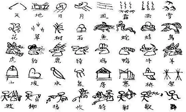 大家可以观察到,东巴文的“水”字,比甲骨文中的“水”字上面多了一个小圆圈,因为在纳西族看来,水来自于山,而山上有泉眼,这就是“水”的来源;甲骨文代表的则是中原文明,在中原人看来,水的形态更多表现为江、河、湖、海。我们从文字中可以感受到古人将生活与自然相融合的智慧。