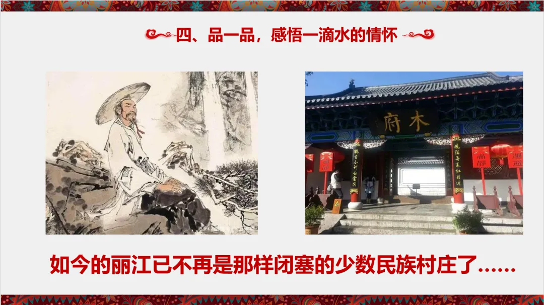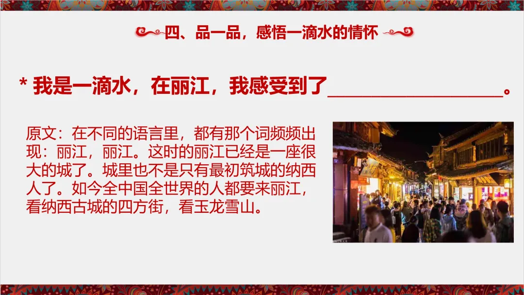 赏析:作者在这里写出了丽江的变化。过去的丽江位置偏僻,很少有人问津。(结合第三自然段木氏家族和徐霞客的故事给学生讲解“土皇帝”的传说,加深学生对这里偏僻的理解。)现在,作者借一滴水的视角,为我们展现了丽江的繁华,越来越多的人来到了丽江这座西南古城,体会这里的风土人情。