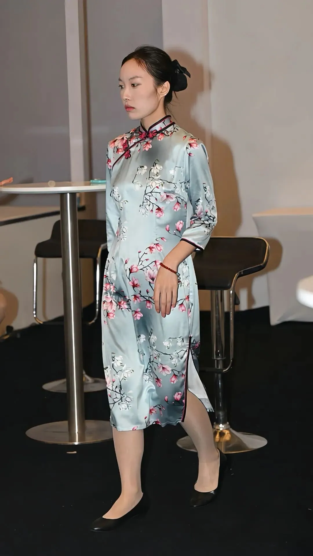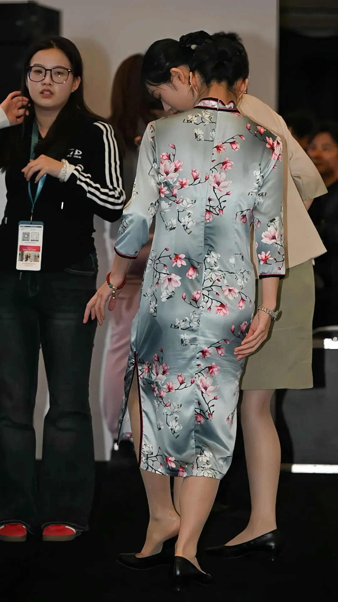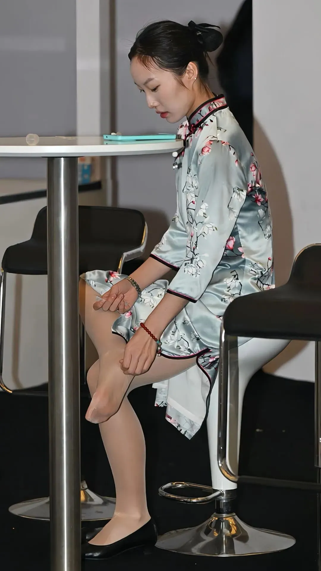 展会的氛围热烈而又充满活力。各种艺术作品琳琅满目,让人目不暇接。而她,就像一颗璀璨的明珠,在这个艺术的海洋中闪耀着独特的光芒。她的旗袍和黑色高跟鞋成为了一道独特的风景,吸引着众人的目光。