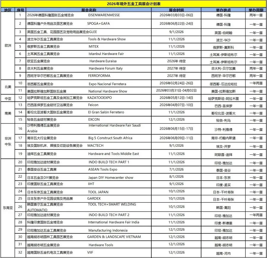 2026年全球五金工具展会计划表