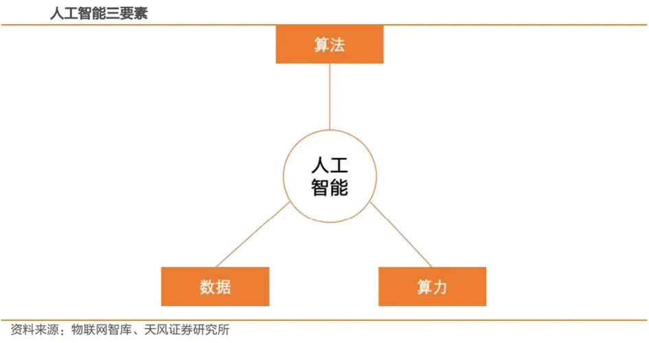数据、算力、算法是人工智能三要素。人工智能模型的应用分为训练、推理两大环节。其中,数据与算力是模型训练的基础,算法是模型实现路径,近年人工智能的快速发展得益于三大要素的共同进步。