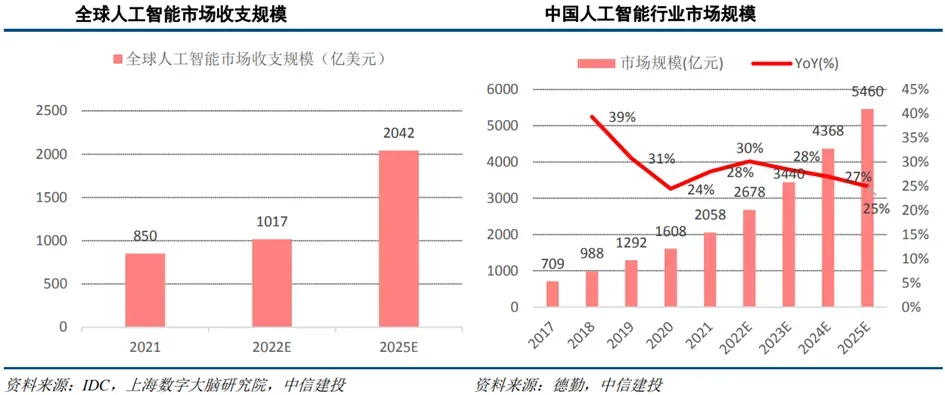 人工智能行业整体市场呈现高速增长趋势。2021年全球市场人工智能市场收入规模(含软件、硬件及服务)达850亿美元。IDC预测,2022年该市场规模将同比增长约20%至1017亿美元,并将于2025年突破2000亿美元大关,CAGR达24.5%。根据德勤数据,中国人工智能市场规模由2017年的709亿元增长至2025年的5460亿元,年均复合增长率为29%。