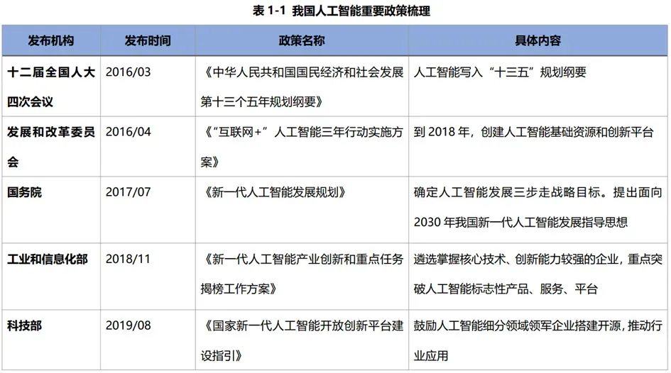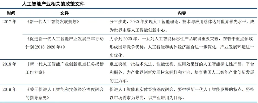 中国方面,以2015年《中国制造2025》出台为开端,人工智能被写入“十三五”规划纲要及政府工作报告。2017年国务院发布《新一代人工智能发展规划》,将人工智能上升到了国家战略层面。随后多部门相继出台若干核心政策和规划,为我国人工智能行业快速发展提供助力。