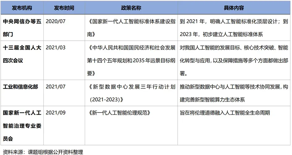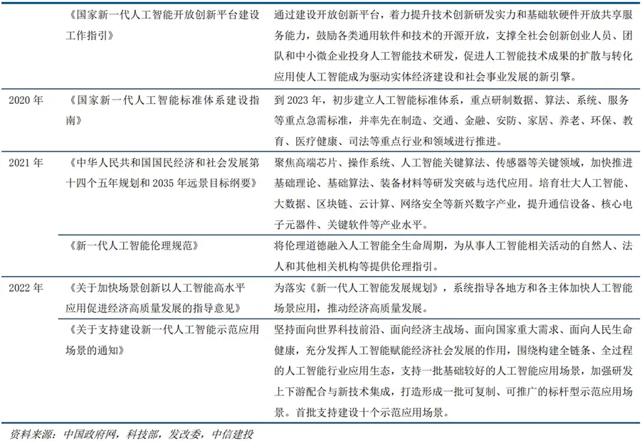 行业长期发展战略清晰明确,政策重点支持。我国2017年提出《新一代人工智能发展规划》,对人工智能的行业发展提出了明确的战略目标,预计到2030年,我国要形成较为成熟的人工智能理论和技术体系,产业竞争力达到国际领先水平。后续密集出台了一系列相关的支持性政策,我国人工智能在国家战略层面,分别从技术突破、人才培养、创新平台、伦理要求、场景应用等方面,形成了一套综合、系统的人工智能建设和发展的顶层设计。近期的政策中更加注重人工智能的场景应用,通过人工智能与实体经济的深度融合,培育新的经济增长点。