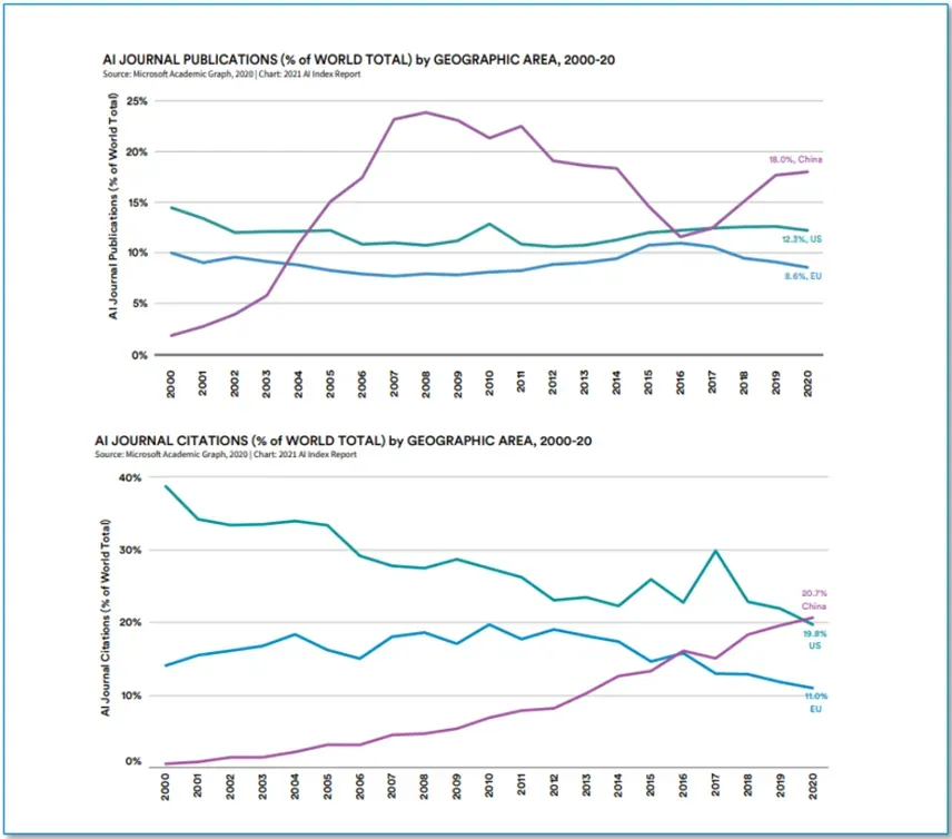 根据斯坦福研究院Human-Centered AI发布的《2021年人工智能指数报告》,在三大人工智能强国(中国、美国和欧盟)中,中国的人工智能论文发表量和被引用量均居全球首位。2020年中国期刊发表数量以18.0%的比例超过美国(12.3%)和欧盟(8.6%)。