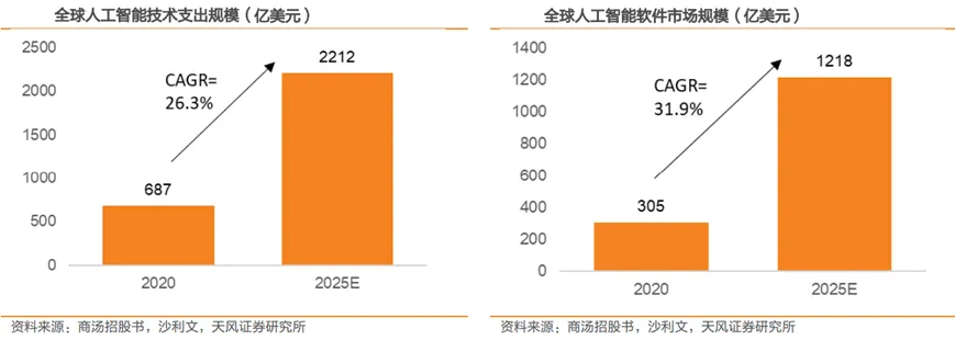 全球人工智能产业规模快速增长,软件占比提升。随着数据量的增长及相关复杂性不断增加,传统软件无法处理、分析及提取其中有用的信息,产生人工智能技术需求。根据沙利文的报告,2020年全球人工智能技术支出(包括硬件、软件、服务)为687亿美元,预计2025年达到2212亿美元,年复合增速达到26.3%。其中人工智能软件支出占比将提高,预计2025年全球人工智能软件市场规模将达到1218亿美元,占总支出比例达到55.1%,2020-2025年复合增速达到31.9%。
