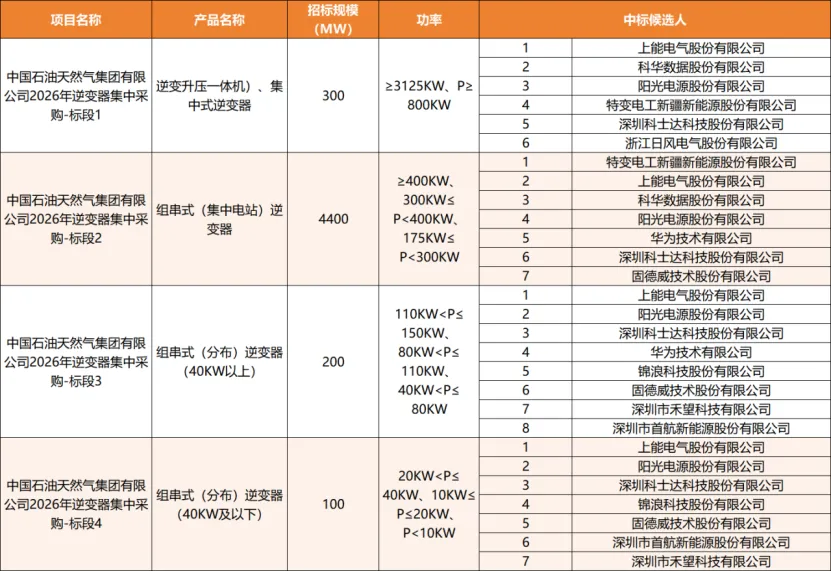 3月27日,中国石油天然气集团有限公司2026年逆变器集中采购(定商定价)项目中标候选人公示,本次集采分为4个标包,合计容量5GW。