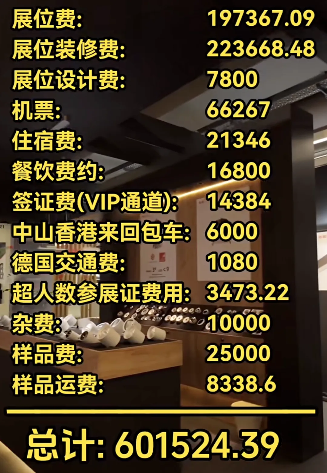 中国照明企业其实很努力:展位上产品琳琅满目、展位越来越漂亮、老板和团队也拼。视频号上有位参展商晒出了此次出行的所有费用:601524.39 ,你认为她的这次出行到底值不值?