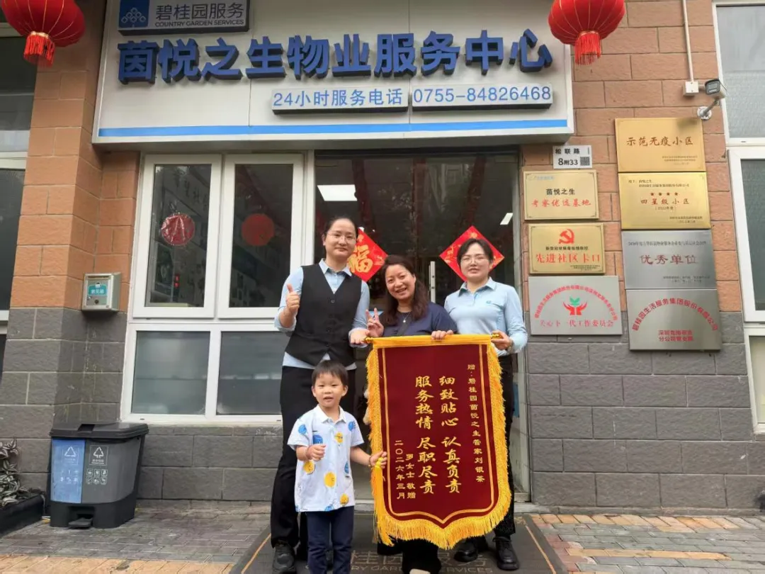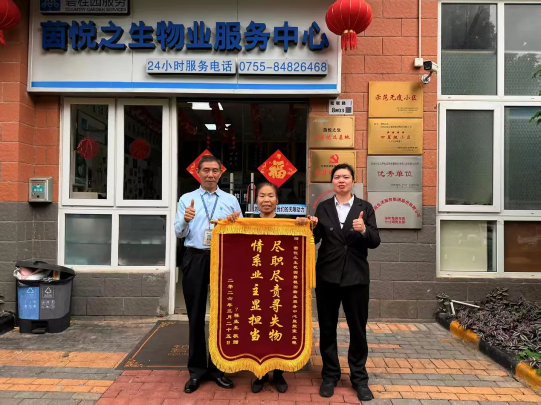 3月31日,深圳茵悦之生花园2栋8单元业主罗女士,特意将一面印有“细致贴心、认真负责、服务热情、尽职尽责”的锦旗送到物业中心,致谢碧桂园服务管家刘银茶,尽心尽责帮其找回误投快递,以朴实方式肯定物业暖心服务。