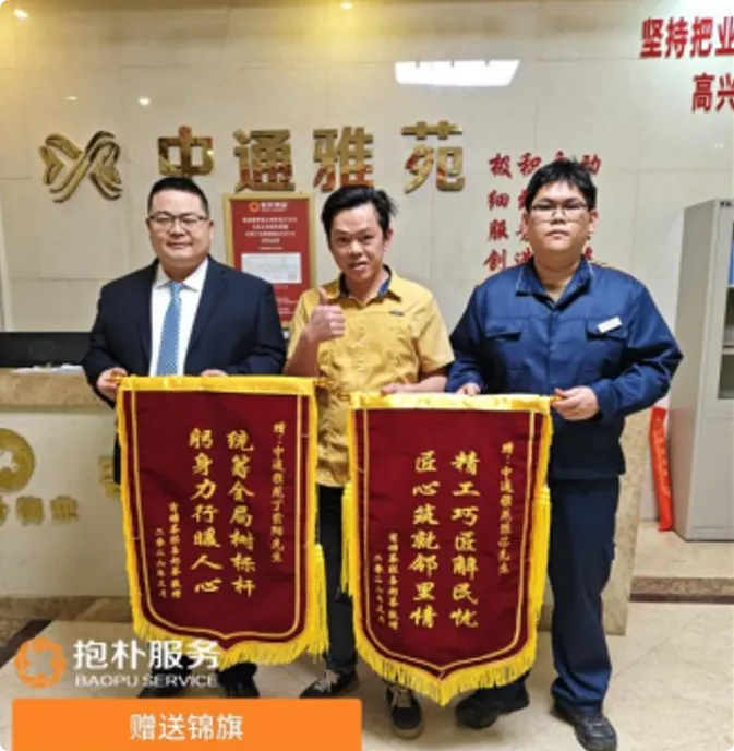 3月16日,深圳市抱朴物业中通雅苑业主陈先生向物业经理丁紫阳和工程员陈德赠送锦旗,表彰其高效服务。锦旗题字“统筹全局树标杆,躬身力行暖人心”和“精工巧匠解民忧,匠心铸就邻里情”。