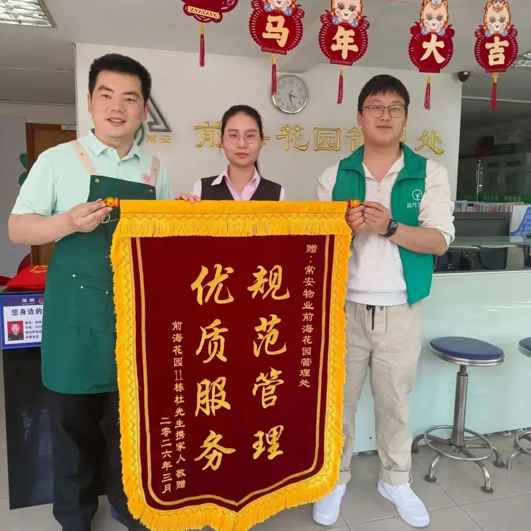 3月16日,常安物业前海花园11栋一楼商铺特意将一面印有“规范管理 优质服务”的锦旗送到前海花园管理处,以此感谢管家王小婉在其入住装修及经营期间的贴心服务与高效保障。