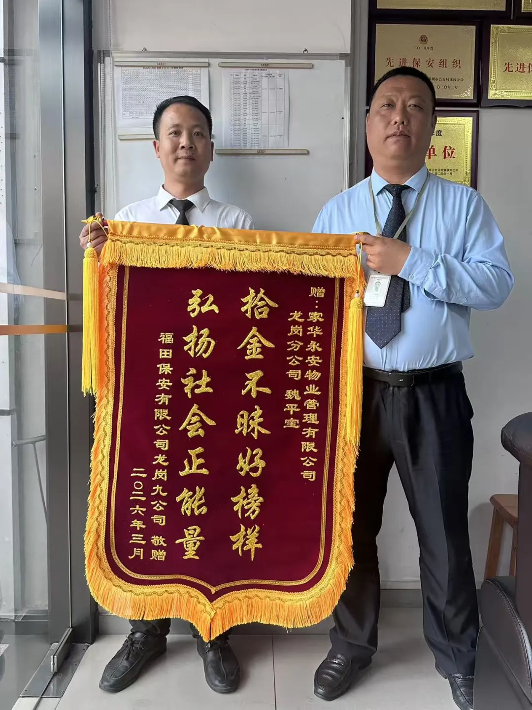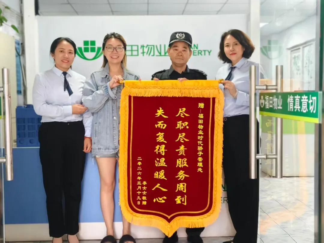 3月25日,市民胡先生专程来到家华永安龙岗分公司管理处,将一面印有“拾金不昧好榜样,弘扬社会正能量”的锦旗送到物业团队手中,对工作人员拾金不昧、高效负责的服务精神表达高度赞誉。
