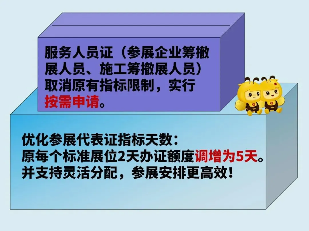 以少跑腿、优体验、畅运行为原则,广交会对部分证件指标进行优化调整,更好满足参展、办证的合理需求。