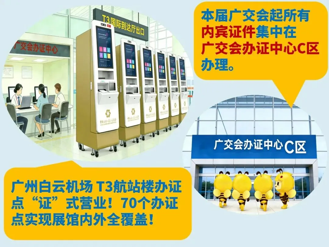 ◉本届广交会首次在广州白云国际机场T3航站楼国际到达厅,增设境外采购商办证服务点。70个办证点位全面覆盖广交会展馆、广州白云国际机场、广州南站、琶洲港澳客运口岸、市内60家指定境外采购商办证酒店及广交会香港办事处,实现落地即办、就近领证!