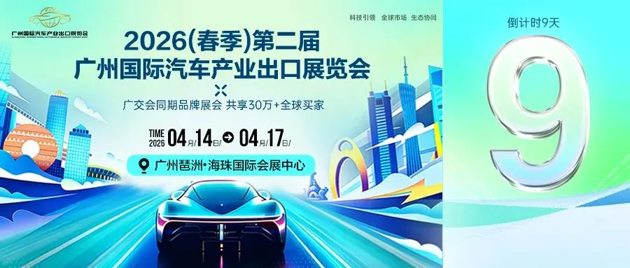 由大湾区汽车产业出口联盟、汽车出口共创联盟(筹)、广东易之行网络科技有限公司联合主办的2026(春季)第二届广州国际汽车产业出口展览会已加载至91%,即将于4 月 14 日在琶洲正式启幕!