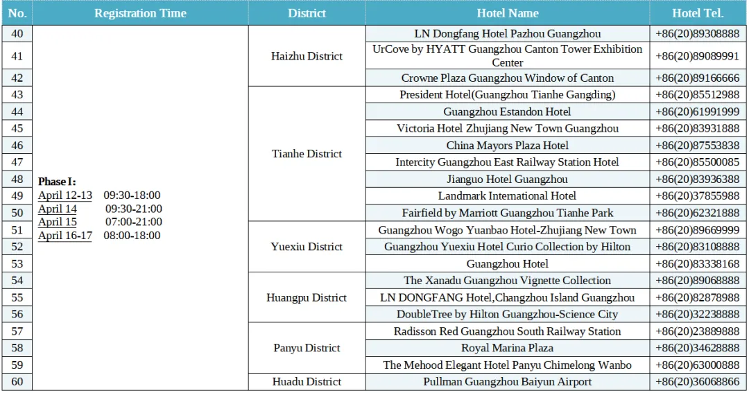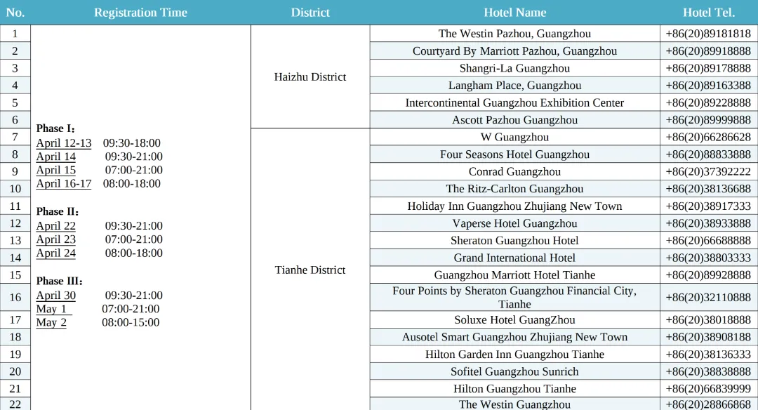 1.The hotel information above is subject to the latest updates published on the Canton Fair website.