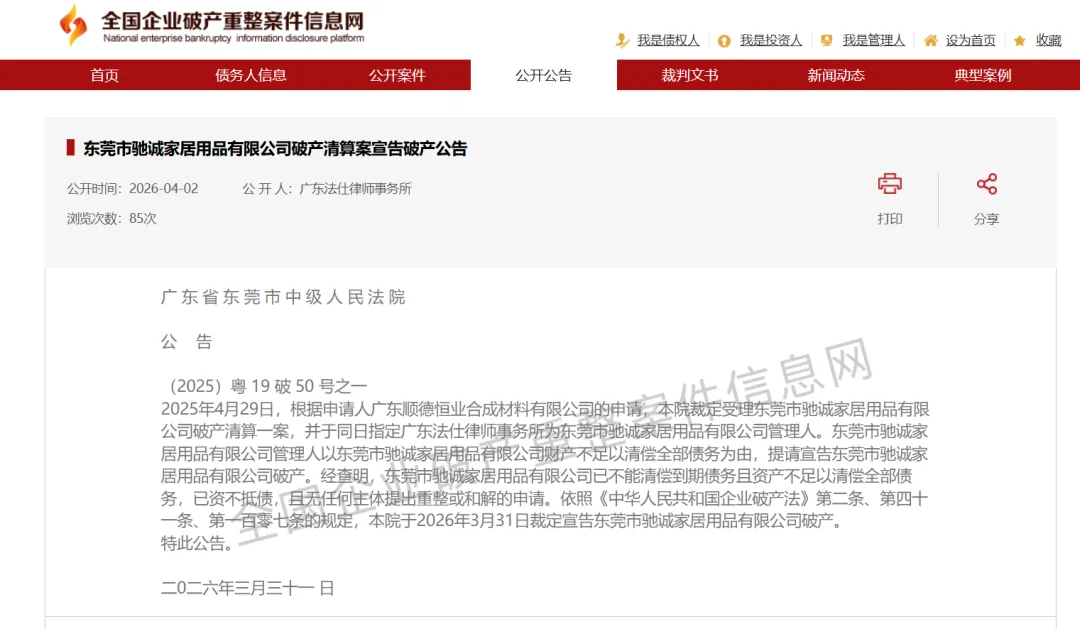 近日,一则来自广东省东莞市中级人民法院的公告,在泛家居圈内引发了不小的关注。曾经在市场浪潮中奋力前行的东莞市驰诚家居用品有限公司,正式被裁定宣告破产。