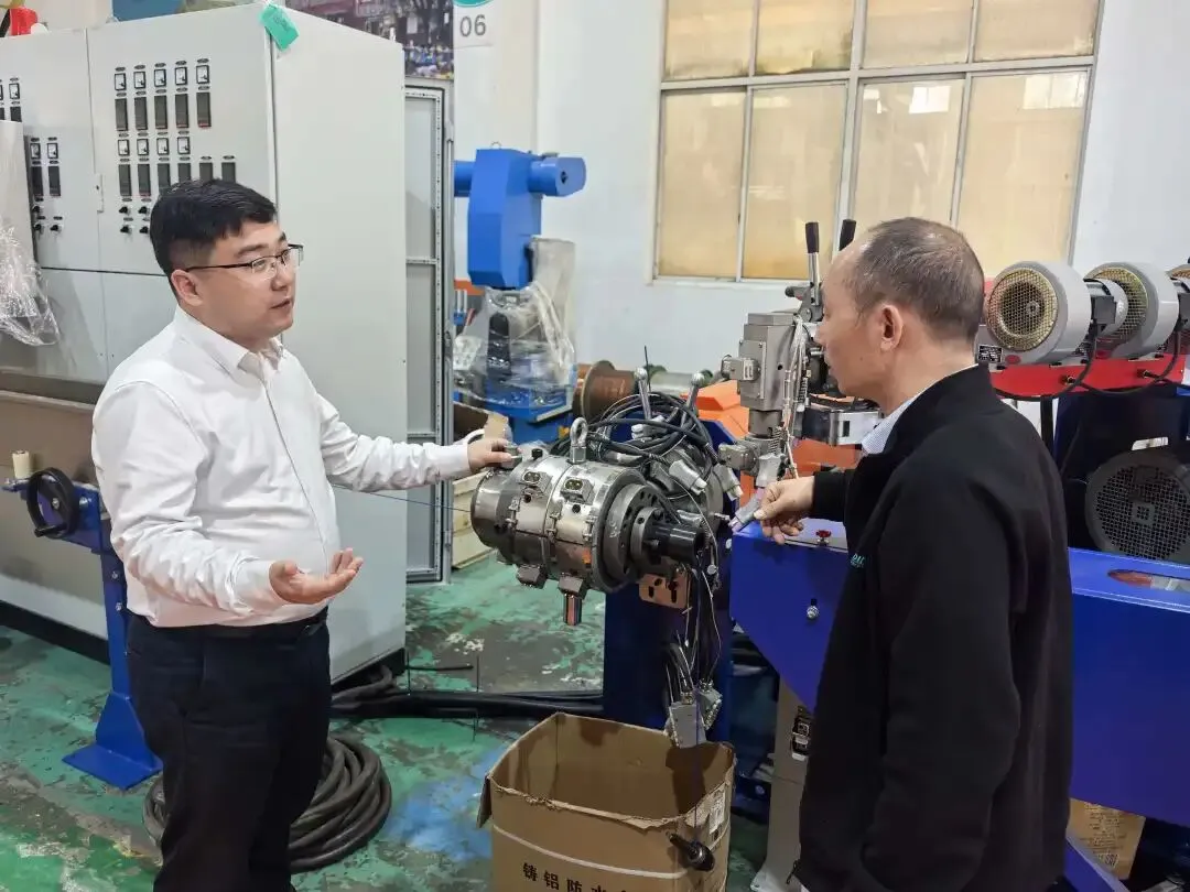 随后,秘书处一行马不停蹄走访了昆山市富川机电科技有限公司,为这家新会员企业颁发会员证书,公司总经理叶小平全程热情陪同。富川机电成立于2006年,二十年来专注于电线电缆专用设备的研发、设计、制造与销售,主营高速绞线机、押出机、成缆机等产品,凭借过硬的产品质量和优质的服务,积累了1500余家客户,产品远销欧美及东南亚市场。公司始终秉持创新精神,推行精益管理,其务实的发展理念和强劲的创新能力,给秘书处一行留下了深刻印象。