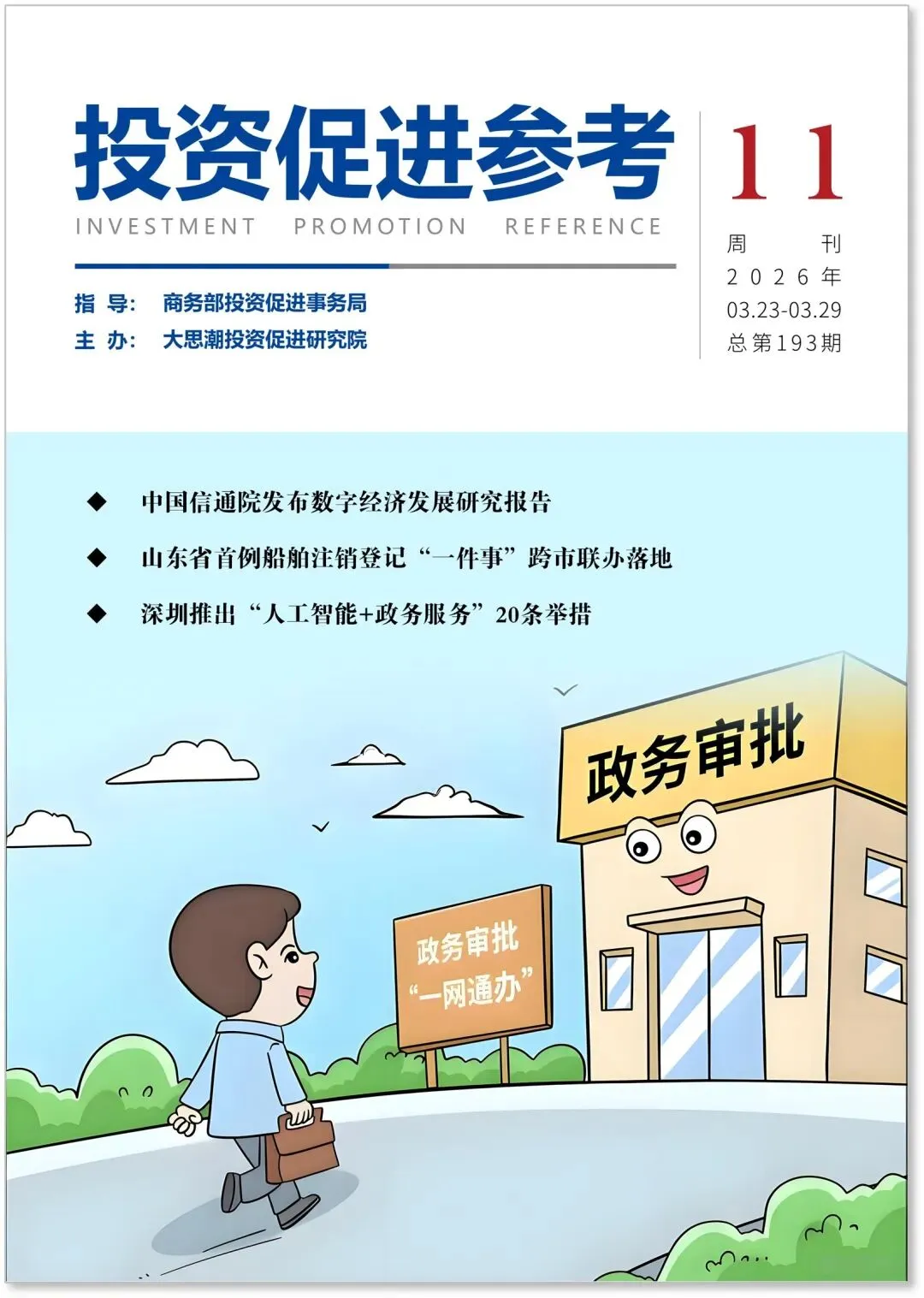《投资促进参考》是商务部投资促进事务局指导,由大思潮投资促进研究院主办的全国投资促进综合性周刊。该刊设置了8个专栏:“智库观察、投促前沿、投促快讯、基金招商、企业投融资、产业投促、园区投促、投资环境”和1个招商引资政策汇编。面向全国地方政府和投资促进机构、园区(开发区)以及国内外企业(投资人)订阅发行。若有需要订阅,可通过底部订阅方式与编辑部联系。