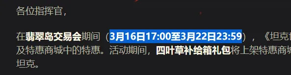 第一个活动叫“战斗任务”:玩家需要在“欢乐时段”(3月16日至3月19日每天17:00至21:00)中,通过战斗来完成可重复的好运任务,不仅有额外的战斗经验和乘员经验作为奖励。还能完成16-22日的“四叶草日”任务,每天最多可以完成7次,完成任务可以获取幸运之印,它们能用来兑换以下奖励: