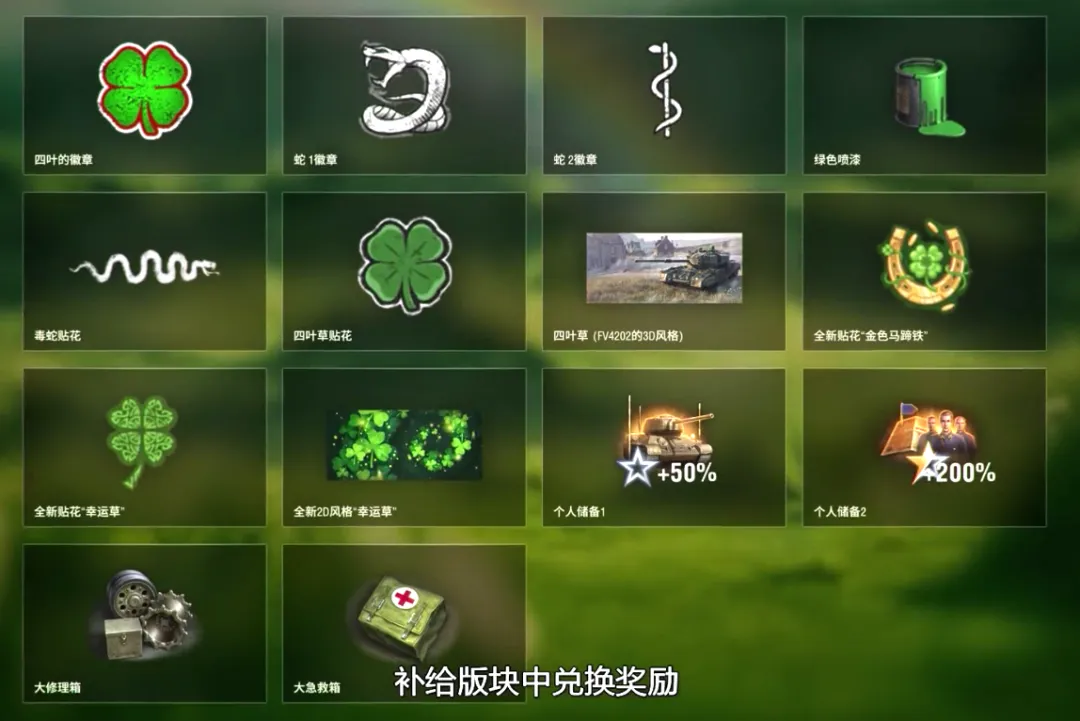 我看了看,其中FV4202的专属3D风格“四叶草”应该是相对而言最划算的了(比起那些贴花来说)。不过大修理、大急救也不错,大家就按照自己的需要来兑换就行。