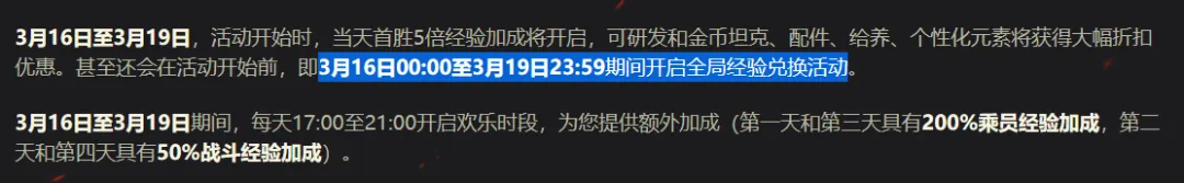 “3月16日00:00至3月19日23:59期间开启全局经验兑换活动”