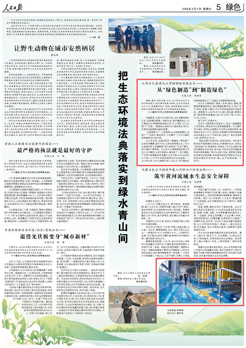 2026年4月4日,《人民日报》第05版整版刊发专题报道《把生态环境法典落实到绿水青山间》,通过五个具体场景集中展现各地各行业落实《中华人民共和国生态环境法典》的务实举措和保护生态环境的积极成效。其中一个具体场景以《江西方大集团九江萍钢钢铁有限公司——从“绿色制造”到“制造绿色”》为题,生动展现了方大企业贯彻落实环保理念,在建设生态景区、大气治理、废水循环利用等方面的成效,再一次向社会各界展现了方大集团以实际行动服务国家战略的责任担当。相关内容如下: