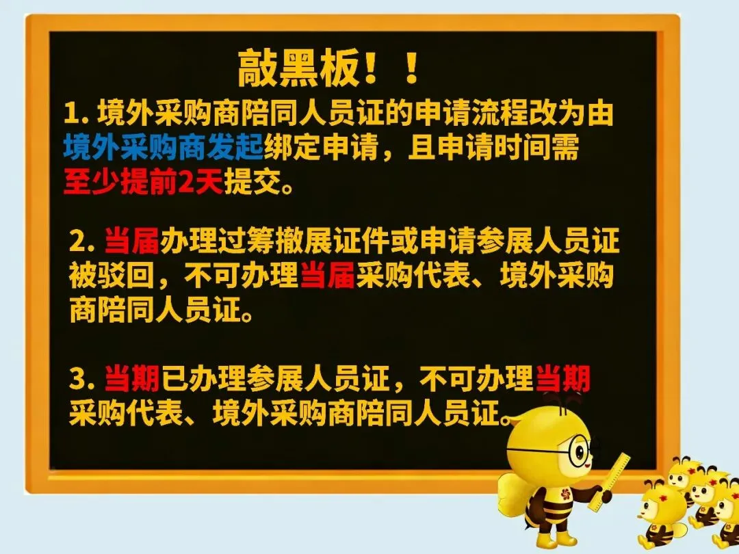 以少跑腿、优体验、畅运行为原则,广交会对部分证件指标进行优化调整,更好满足参展、办证的合理需求。