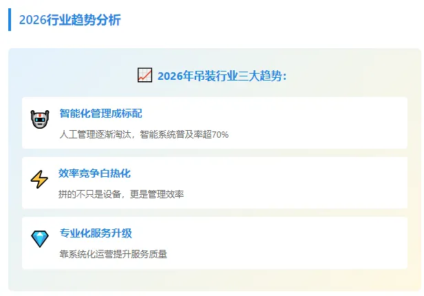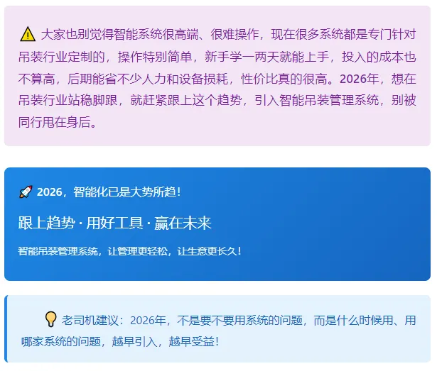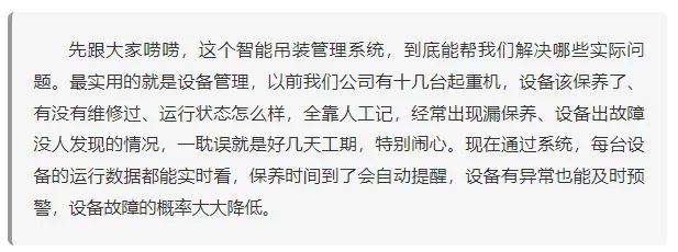 估计还有不少同行觉得,智能管理系统就是个"花架子",没必要花钱投入,靠人工记账、电话调度,也能搞定。说实话,我以前也这么想,觉得没必要多花那份钱,直到去年我们公司引入了智能吊装管理系统,才发现是真的香,不光省了不少人力,效率还提上去了,设备损耗也少了很多。