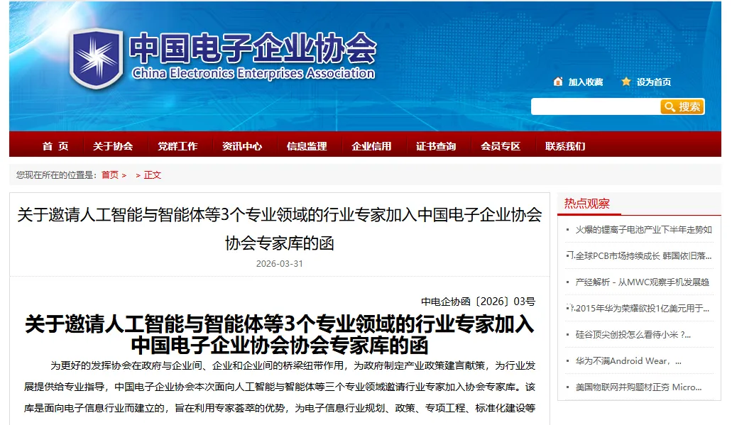 为更好的发挥协会在政府与企业间、企业和企业间的桥梁纽带作用,为政府制定产业政策建言献策,为行业发展提供给专业指导,中国电子企业协会本次面向人工智能与智能体等三个专业领域邀请行业专家加入协会专家库。该库是面向电子信息行业而建立的,旨在利用专家荟萃的优势,为电子信息行业规划、政策、专项工程、标准化建设等提供战略谋划,增强电子信息企业实力和国际竞争力,为电子信息产业做大做强、可持续发展作贡献。具体事项通知如下:
