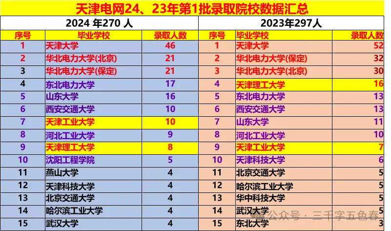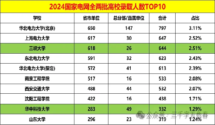 2024年国家电网校招录用名单中,人数最多的华北电力大学,北京和保定两个校区人数650+572人,其次是上海电力大学,三峡大学人和东北电力大学;