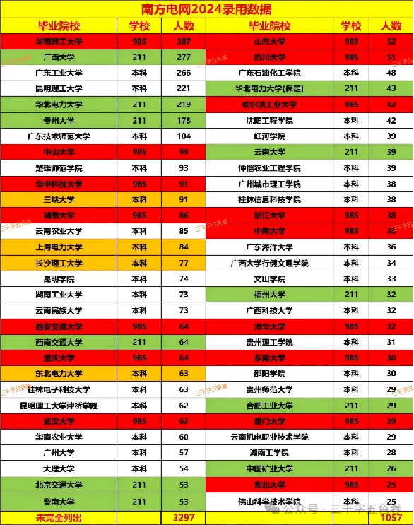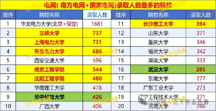 2024年国家电网和南方电网 校招录用名单中,人数最多的华北电力大学,北京和保定两个校区人数1681人,其次是三峡大学737人,上海电力大学731人和东北电力大学686人