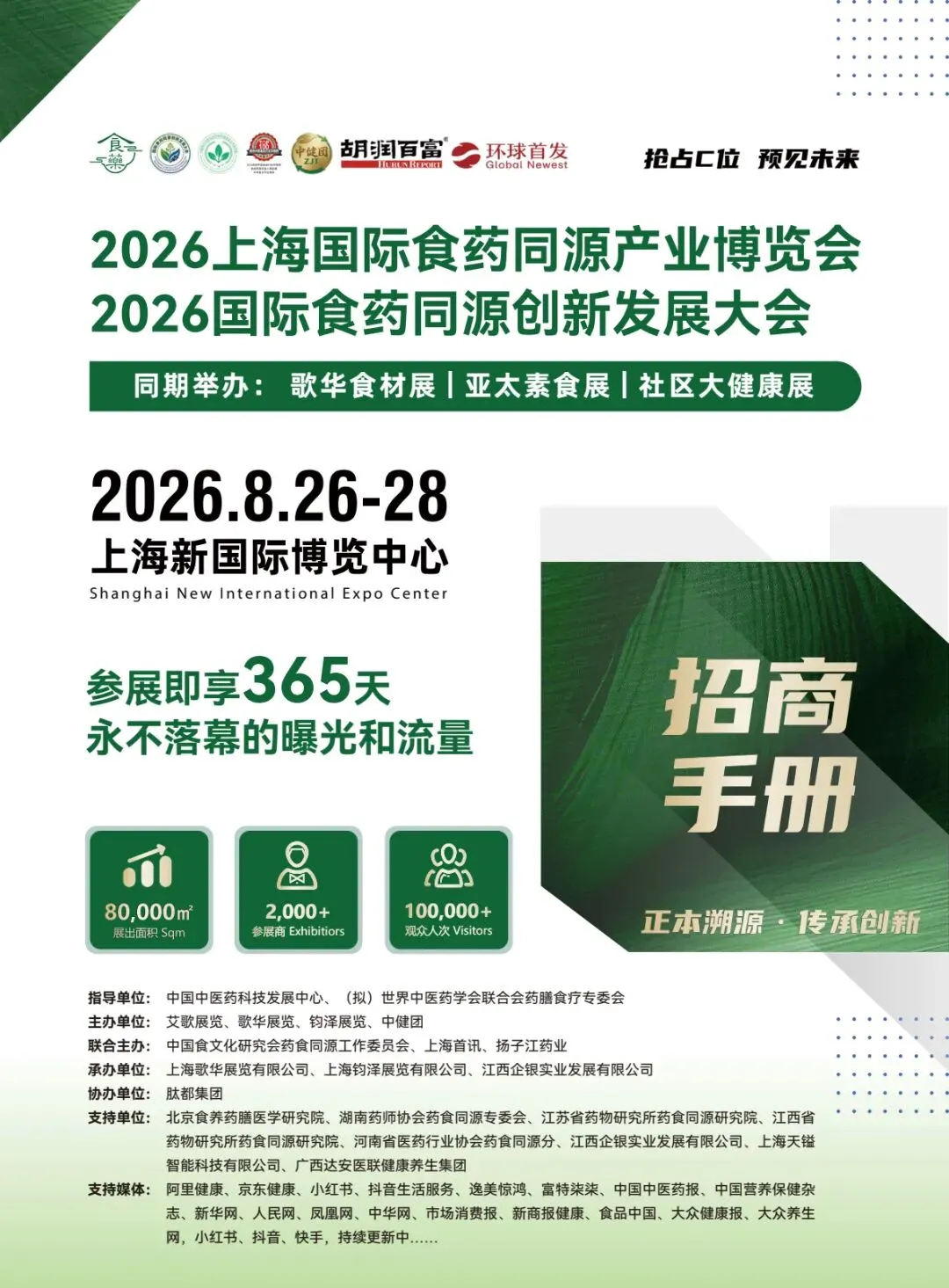 2026年8月26-28日一场聚焦“食药同源”产业的国家级盛会将在上海浦东新国际博览中心盛大启幕。以“食药同源,健康中国”为主题,携手产业链上下游伙伴,共同打造中国食药同源产业第一展!