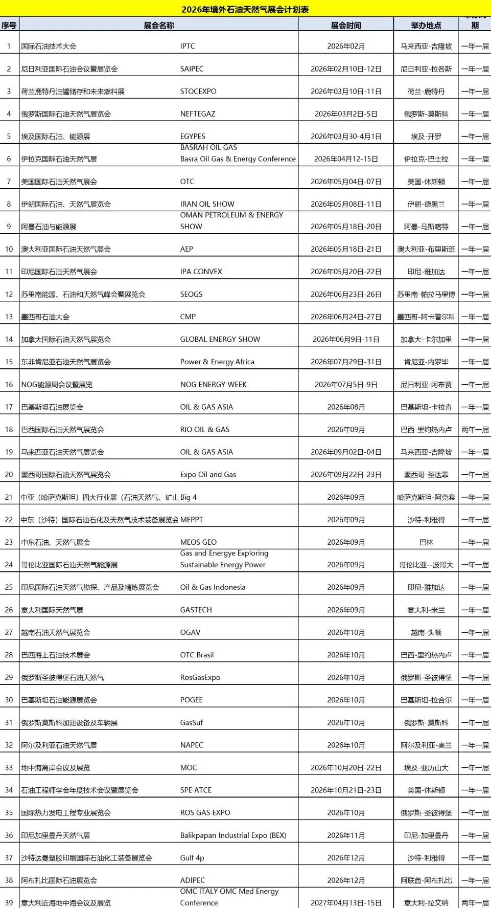 2026年 全球石油天然气展会清单