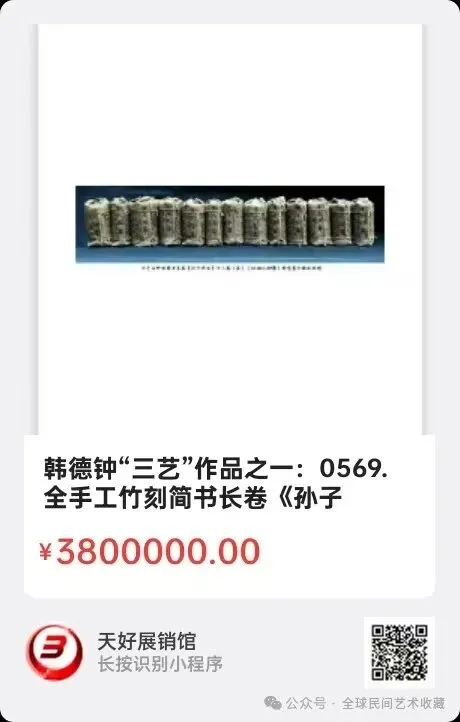 韩德钟“三艺”作品之一:全手工竹刻简书长卷《孙子兵法》十三篇(卷)。简介作者从上世纪1996年开始策划构思至2000年创作完成,共耗时五年。内容采用《孙子兵法》标准文本为蓝本,即1990年由中国军事科学出版社吴九龙大校主编的《孙子校释》。该长卷总长58.8米,高0.32米,总重52.5公斤,净重40公斤。作者匠心独运,刻意求新,把汉简笔意融入竹刻创作中,将《孙子兵法》全文十三篇,共6027字,分别用手工刀刻在1026片每条约4X32厘米不等的小竹片上,工艺严谨且规格整,黑底绿字,古色古香,通篇布局上下衔接,线条光洁秀美,疏密有致,意态翩跹且雅俗共赏。小竹片均已通过去青、打磨、上漆、钻眼、穿绳,再100度高温脱水等特殊工艺加工处理。且不生虫,不发霉,不开裂,不变形。具有较高的艺术价值、实用价值、欣赏价值和收藏价值。该长卷于2000年应邀参加《中国艺术交易博览会》(山东烟台),被组委会和香港在线联合授予《中国最具收藏价值500强艺术家》荣誉称号及铜匾,分别于2003、04年在长沙湖南美术馆和湘潭群艺馆举办展览,又于2023年参加纪念改革开放四十五周年,“春风杯”全国优秀艺术作品评选活动,获入选并由央视艺术传承栏目和文旅部所属中国书画艺术指导委员会联合遴选推荐至国家博物馆入档编号收藏(国博收藏证号:1334)。创作时间:2000年,规格尺寸:58.8米X0.32X13卷,材质:竹片,0569.V.
