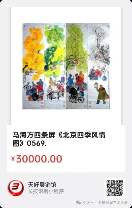 马海方四条屏《北京四季风情图》,马海方:1956年生于北京大兴县,1981 年毕业于中央美院中国画系。师从著名画家卢沉、姚有多、刘勃舒诸先生。现为中国美协会员、荣宝斋画院教授、荣宝斋签约画家、人民美术出版社画家、人民美术出版社《中国书画》杂志编辑、北京文史馆馆员、文化和旅游部国韵文华书画院艺术委员会副主。规格尺寸:138X34㎝X4,材质:生宣纸本原片。0569.V.