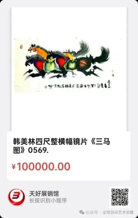 韩美林四尺整横幅镜片《三马图》,韩美林:1936年生于山东济南。1955年考入中央美院,1956年随院系调整成为中央工艺美术学院的首届学生。全国政协委员、奥运福娃设计师。创作时间:2010年。规格尺寸:138X68㎝,材质:生宣纸本原片。0569.V.