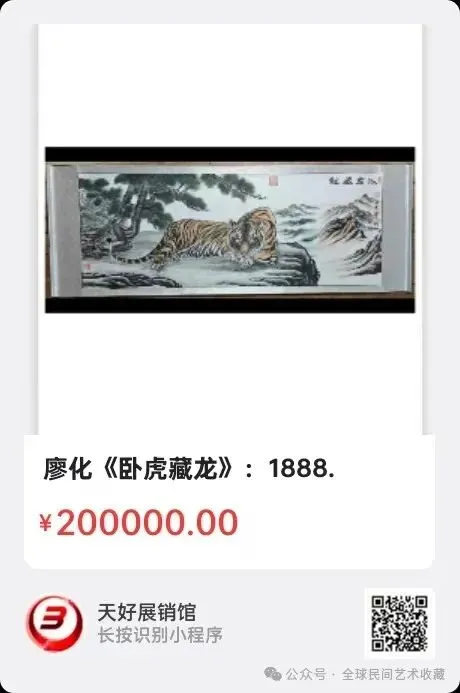藏家速览!廖化《卧虎藏龙》:艺术与财富的双重密码,张大千再传弟子、大风堂嫡脉廖化,以中国美协会员、荣宝斋终身顾问的身份,稳坐当代艺术界顶流席位。其作品不仅入选大红袍画册,艺术价值备受认可。2017年,《卧虎藏龙》在中国嘉德拍卖会以26.8万元惊艳成交。画面中,猛虎盘踞苍岩,目露锋芒,工笔精琢的皮毛质感逼真,写意勾勒的苍松云雾意境悠远,工写交融间尽显东方美学神韵。,截至2024年8月,廖化作品拍卖总额突破三亿,市场热度居高不下。这幅《卧虎藏龙》既是艺术匠心的凝练,又蕴含"动静相生"的哲学智慧,更是极具潜力的收藏珍品。对于志在构建顶级收藏体系的藏家而言,无疑是不容错过的投资良机!名称:《卧虎藏龙》,规格:210X50cm=10平尺。来源1888。