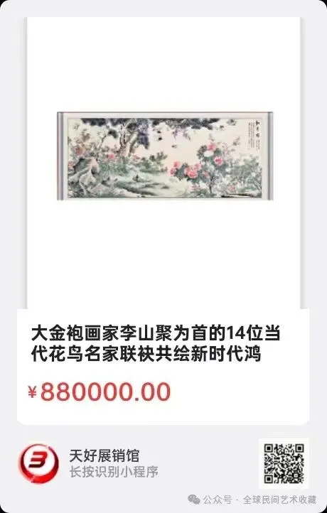 为纪念世界和平大会70周年,更好传播中国热爱和平的时代强音,国家特邀齐白石再传弟子大红袍,大金袍画家李山聚为首的14位当代花鸟名家,首次以70年前和平颂为蓝本,联袂共绘新时代鸿篇巨制《和平颂》,历时两年(700多天才完成)。《和平颂》366*144=48平尺。来源1888.