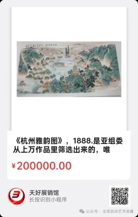 《杭州雅韵图》是亚组委从上万作品里筛选出来的,唯一一套公开发行的书画作品,填补了亚运会书画历史的空白,藏稀缺,这是藏品升值的准则。《杭州雅韵图》245*122=27平尺。来源1888.