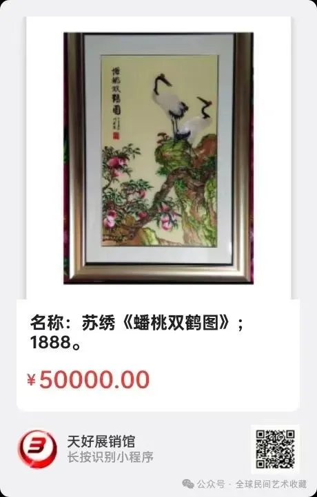名称:苏绣《蟠桃双鹤图》;规格:39.5×64=3平尺,装裱:61×88;原作历史背景:《蟠桃仙鹤图》原作珍藏北京故宫博物院,为清乾隆宫廷画师邹一桂作品,故宫传世名画之一,画面上两只丹顶鹤立于青石之上,姿态悠然自得,生动形象;青石之上祥花瑞草长生,石隙间一株桃树屈曲蟠覆,硕果累累,陡石之下,朱泉永浏。此画构图简洁疏朗,笔法练达,设色艳丽而自然,晕染细致,富有真实感,构成一幅他题词中所说“瑶圃仙口,拔地奇陡,上薄云霄,下绝尘垢”的人间仙境。这幅作品作于乾隆十六年(1751年),是他65岁,正值其绘画生涯中娴熟高超时期,他根据麻姑献桃的传说构思了这幅瑶圃,蟠桃,仙鹤图来祝福皇帝长生不老。何建英大师,中国非物质文化遗产传承人,苏绣中华一笔福创始人!她的作品先后多次在中国工美术大师精品博览会评比中荣获金奖、银奖等荣誉;许多作品被多家博物馆和海内外知名人士收藏。苏绣作品屡获荣殊荣,其代表作不胜枚举,2019年8月创作的苏绣《蟠桃双鹤图》再次被国家赠送前日本首相鸠山由纪夫先生!来源1888.