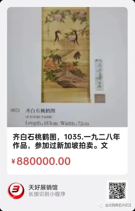 齐白石桃鹤图,一九二八年作品,参加过新加坡拍卖。文革时期收藏的真品。尺寸图片有,来源:1035。