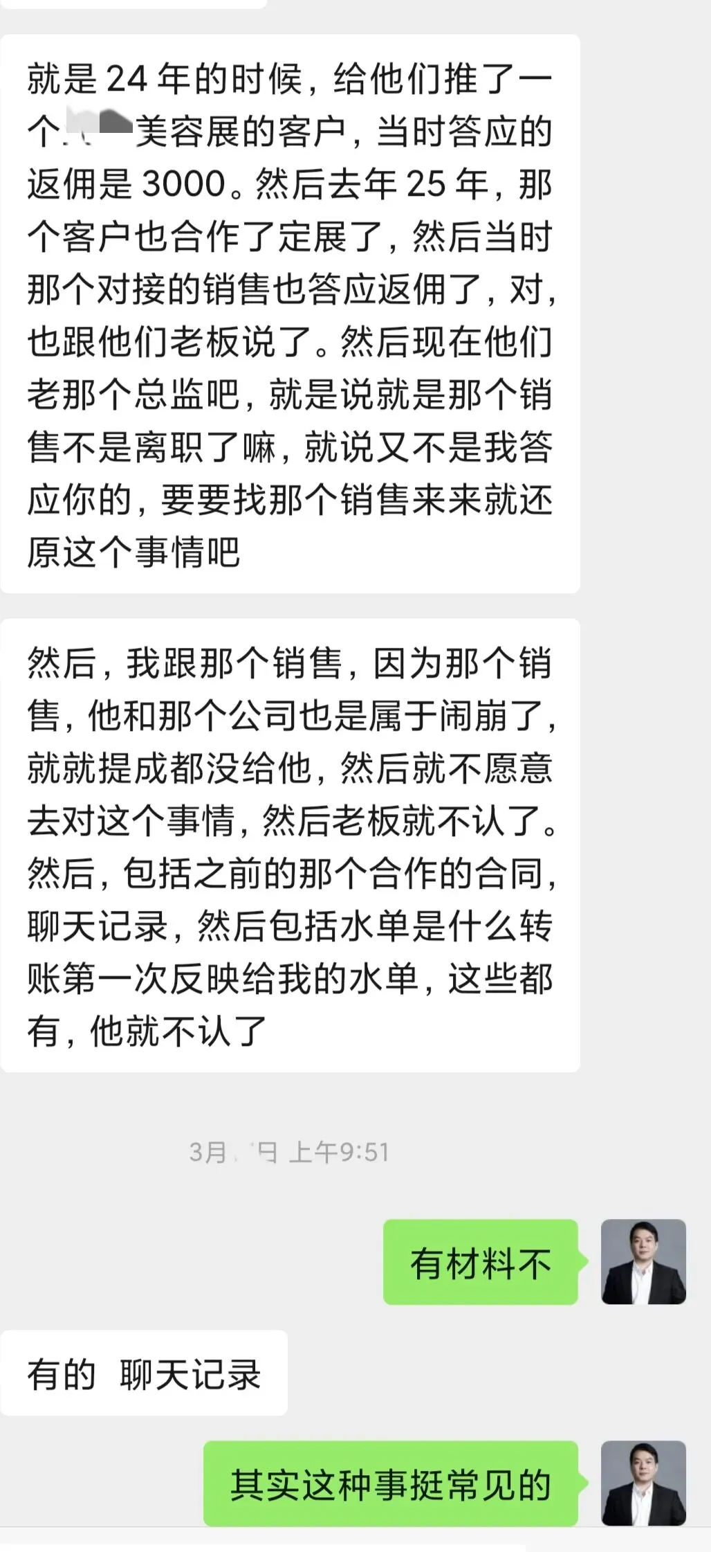事情是这样的:2024年,这位同行给某美容展的销售推荐了一个参展客户,当时双方明确约定了3000元的返佣。到了2025年,这个客户再次合作定展,对接的销售也再次承诺了返佣,甚至还跟自己的老板同步了这件事。