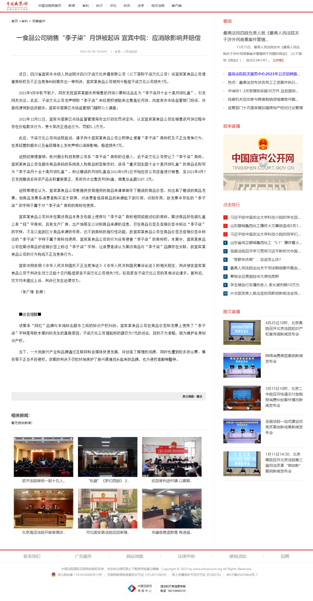 5月9日,人民法院报报道《一食品公司销售“李子柒”月饼被起诉 宜宾中院:应消除影响并赔偿》。