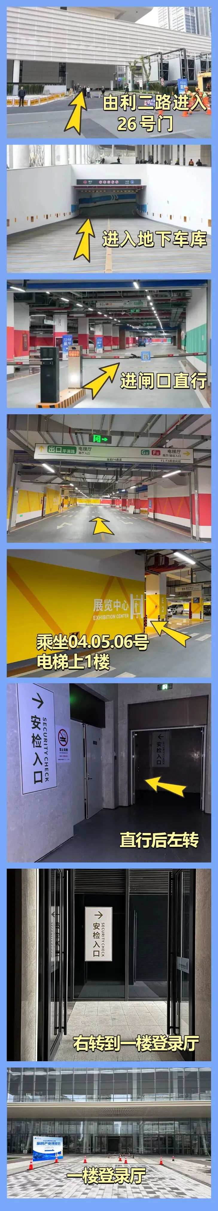 请导航至“杭州国际博览中心二期26号门”→进入地下车库→进闸口直行→乘坐04、05、06号电梯上1楼→直行后左转→右转到1楼登录厅。