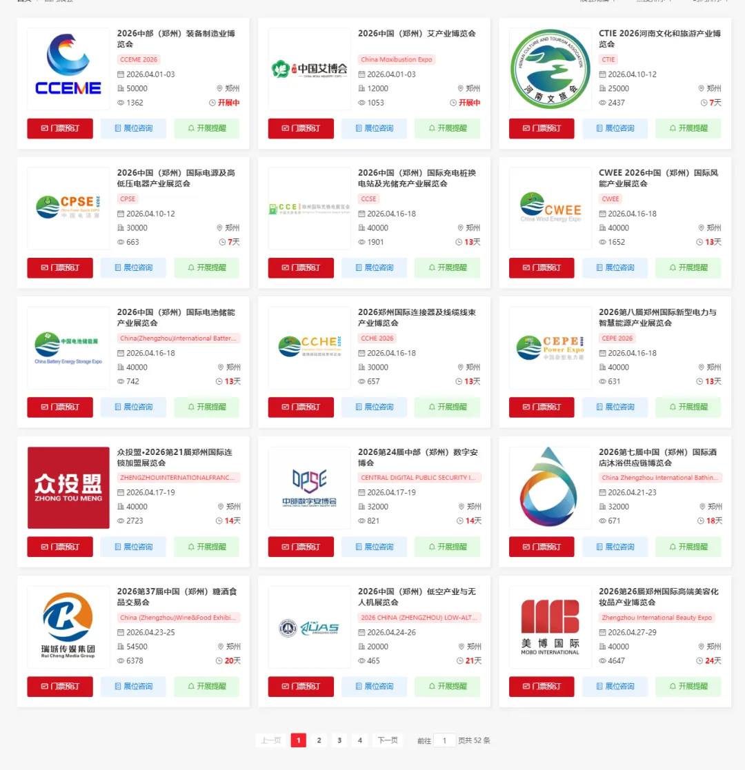 2026年4-12月郑州将举办多场重要的展会活动,涵盖了工业、中医、文化、电力、电池、风能、充电桩、电线电缆、安全、加盟、泳池桑拿、糖酒、无人机、美容、工业、五金、农业、自有品牌、劳保、泵阀、照明、零售、宠物、教育、建筑工程、仪器设备、健康、酒店用品、太阳能光伏、煤炭、汽车、润滑油、食品配料、物流、跨境电商展等多个领域。小编为大家整理了2026年4-12月郑州展会排期表,希望能帮助你规划行程。末文获取郑州展会门票/展位预约入口~(大多门票限时免费)