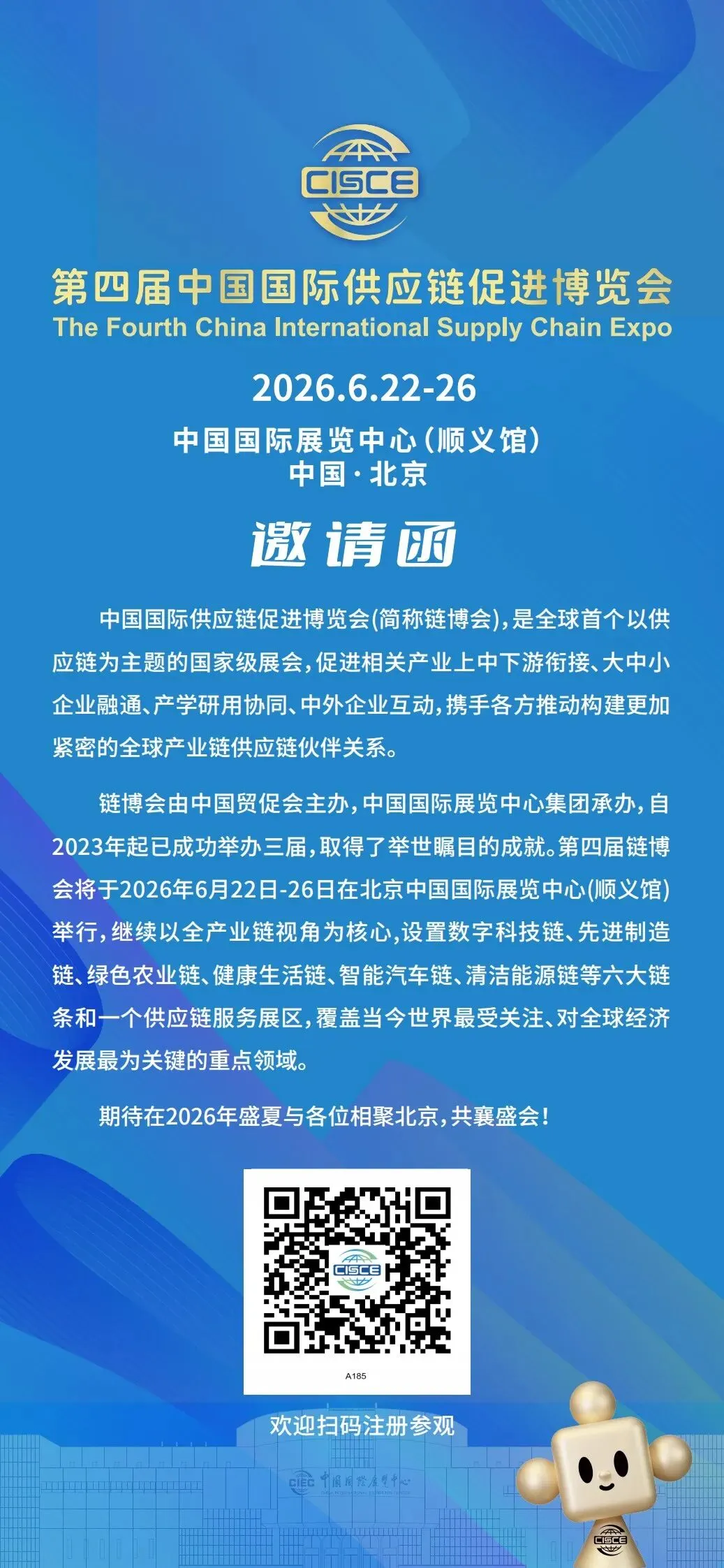 中国国际供应链促进博览会(以下简称“链博会”)是全球首个以供应链为主题的国家级展会。第四届链博会定于2026年6月22日至26日在北京举办,总面积12万平方米,继续以全产业链视角为核心,设置先进制造链、清洁能源链、智能汽车链、数字科技链、健康生活链、绿色农业链等6大链条和供应链服务展区,邀请全球顶尖企业展示代表行业未来趋势的产品与技术。