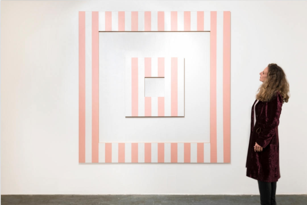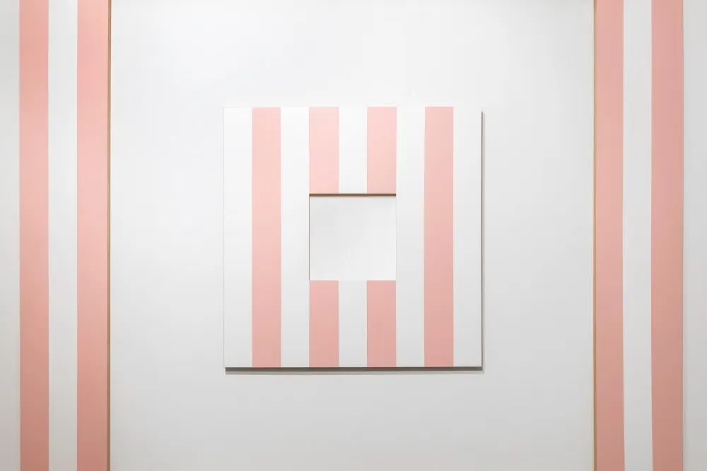 ▲ 丹尼尔·布伦 (Daniel Buren)《媒介上绘画 - D - 绣球花》Peinture sur medium – D – Hortensia, 1991年10月, 被定位作品 (situated work), MDF木材上绣球花色丙烯酸涂料、8.7厘米宽幅白色乙烯基胶带, 外框 (外围: 200.1 x 200.1 x 1.9厘米, 内围: 147.9 x 147.9 x 1.9 厘米); 内框(外围: 78.3 x 78.3 x 1.9厘米, 内围: 26.1 x 26.1 x 1.9厘米), 版数:独版, ©️艺术家与常青画廊